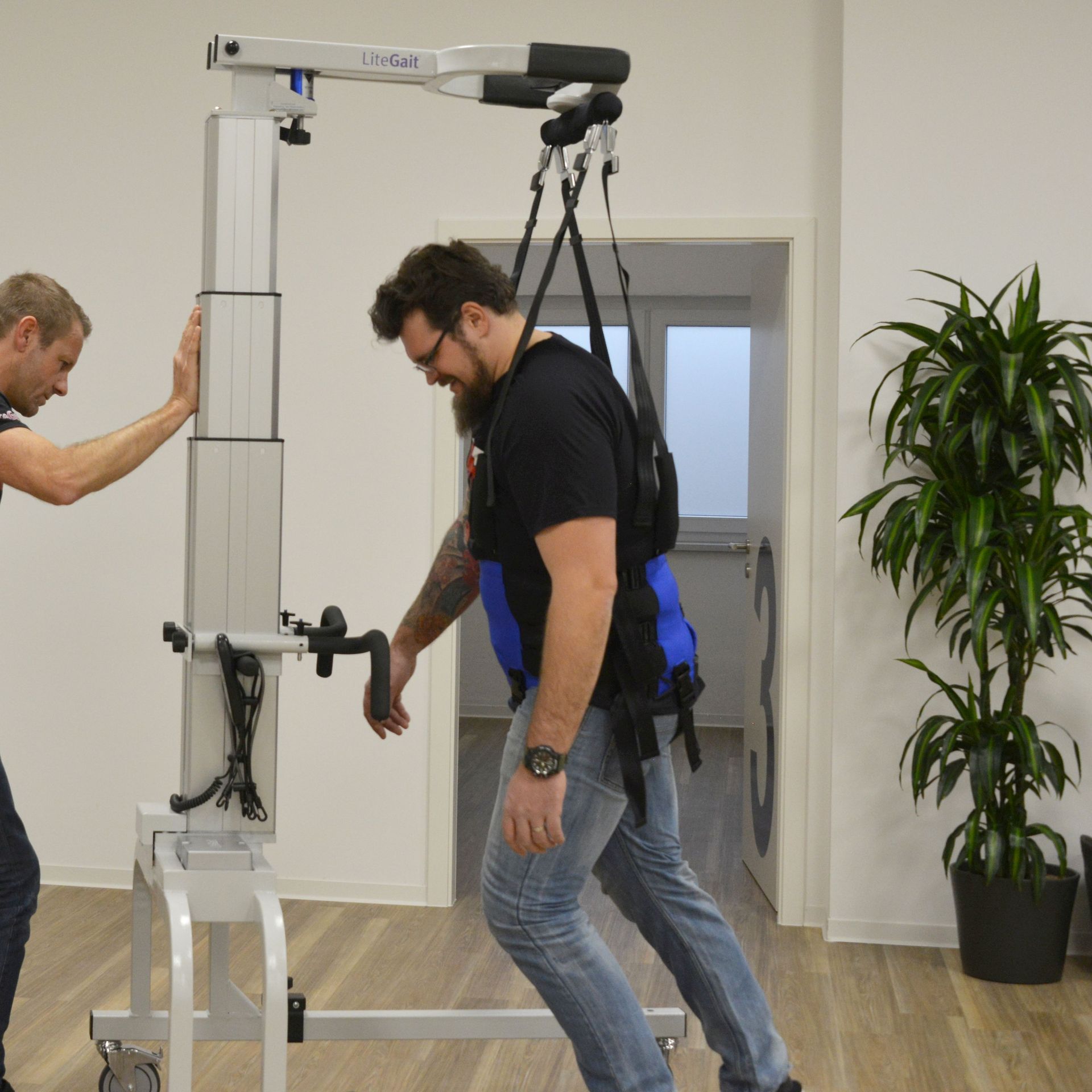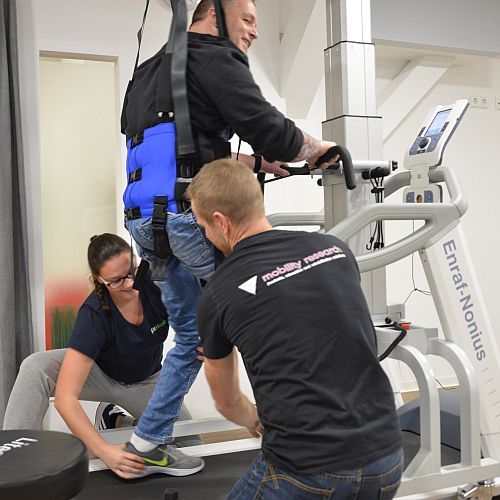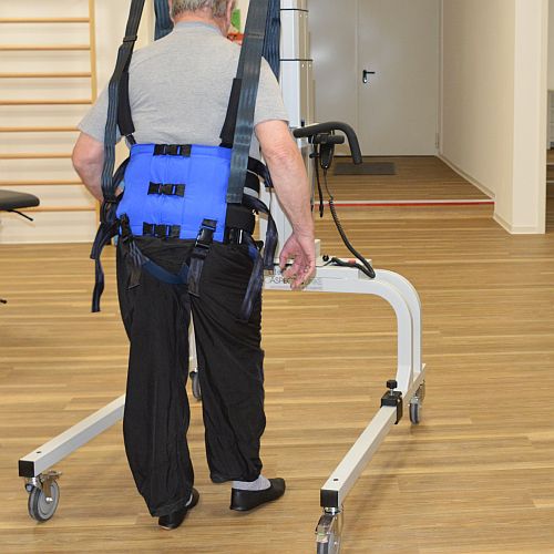 Dadurch ist der Therapeut frei, er kann das Bewegungsbild beobachten, das Gehen unterstützen oder korrigieren und mit dem Patienten wirksam arbeiten.