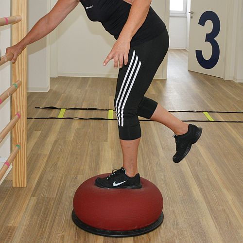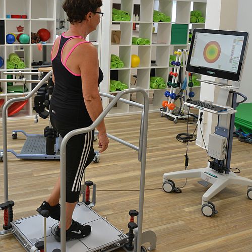 Hanteln Balance- und Stehtrainer Theratrainer Spiele Vibrationsplatte Theraband Elektrotherapie Ultraschall Wärme Kälte NuStep Ganzkörpertrainer für stark eingeschränkte Patienten Extension Seilzug Gehstrecke Sprossenwand Fango Bälle Kegel und Gewichte Beinpresse fette Matten Gehtrainer LiteGait für gesichertes, angstfreies Gehen auf der Fläche und am Laufband ab 0,4 km, Steigung, Gefälle Balancetrainer Posturomed mit FeedBack und Doku-Software Lateralzug Airex Matten Terrasensa Elektrostimulation Hindernisbahn Ergometer Trampolin Pezzibälle u.v.a.m.